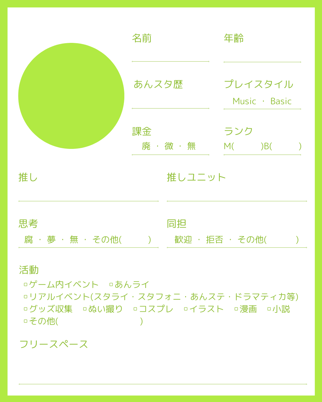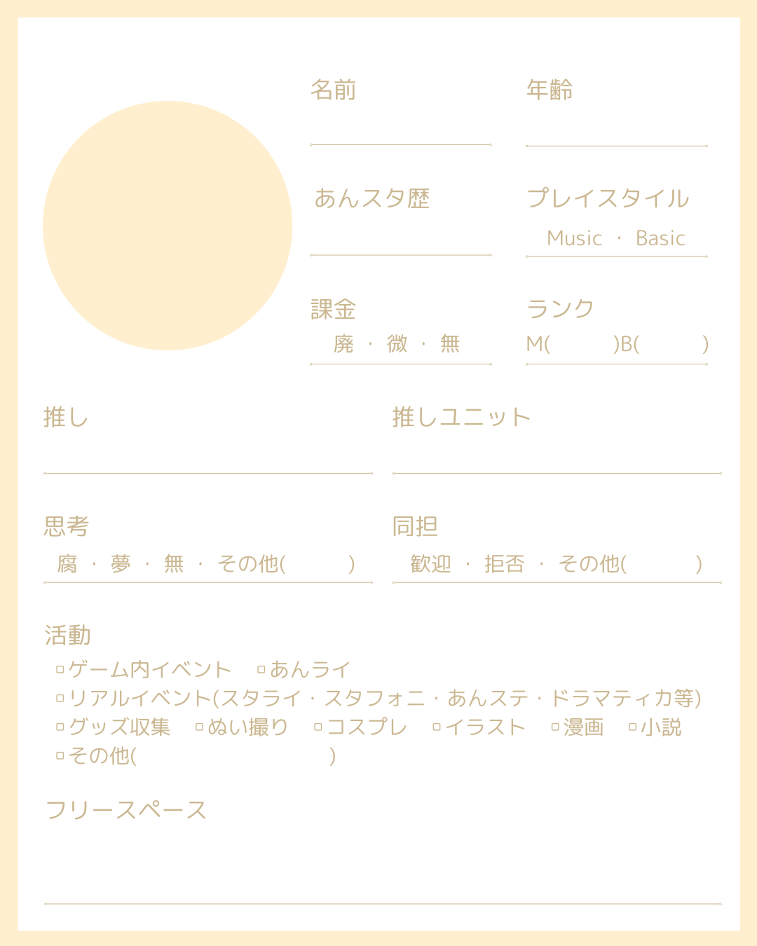 名前や年齢だけでなく、推しや好きなコンテンツに対する思いを綴ることができます。